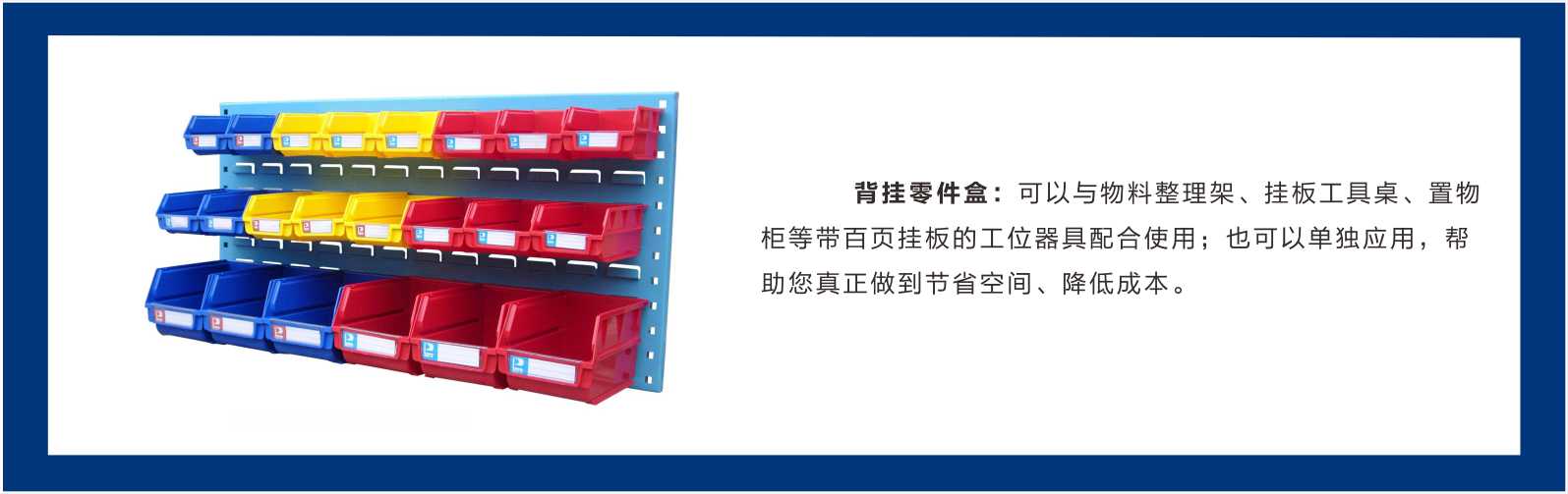 | 1.背掛零件盒的庫(kù)存產(chǎn)品為藍(lán)色、紅色和黃色,最低起訂量1個(gè)包裝箱。也可以定制綠、黑、灰等其他顏色,最低起訂量500只。 |