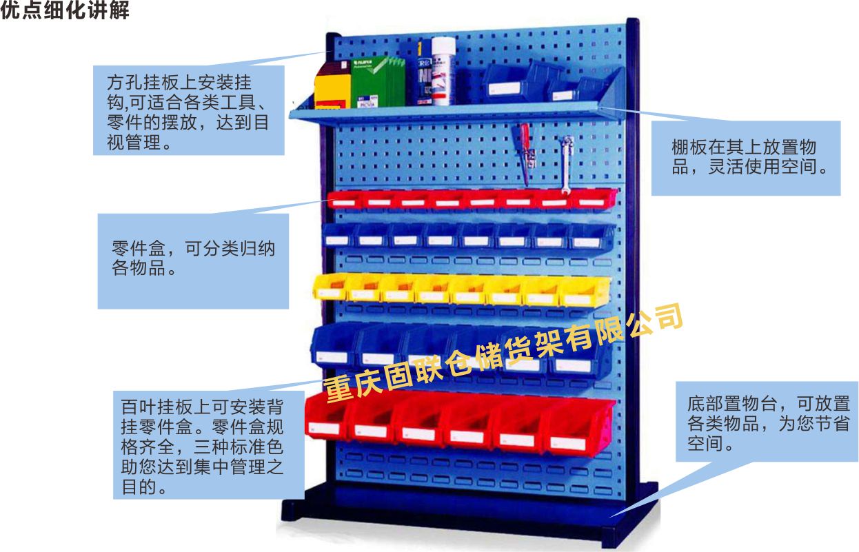 KR-獨立型:獨立型物料整理架由掛板、底板及二根立柱組合而成,有單面型和雙面型兩種結構,靠墻放置時通常采用單面型。