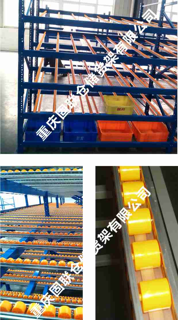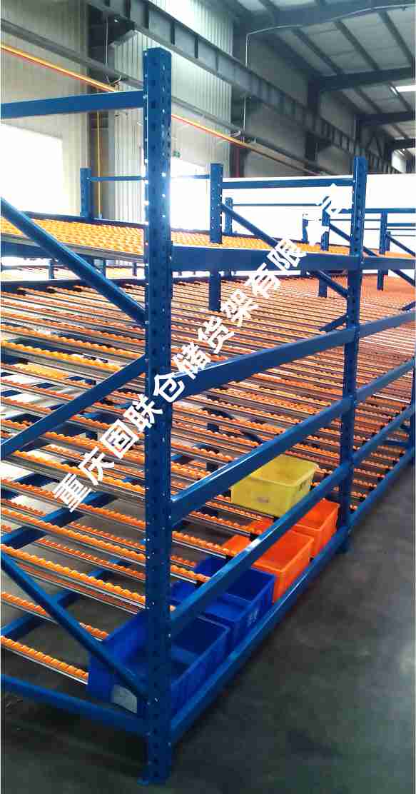 滾輪式料架簡(jiǎn)稱(chēng)流利架,是將貨物置于滾輪上,利用一邊通道存貨,另一邊通道取貨。料架朝出貨方向向下傾斜,貨物在重力作用下向下滑動(dòng)。可實(shí)現(xiàn)先進(jìn)先出,并可實(shí)現(xiàn)一次補(bǔ)貨,多次揀貨。流利架存儲(chǔ)效率高,適合大量貨物的短期存放。